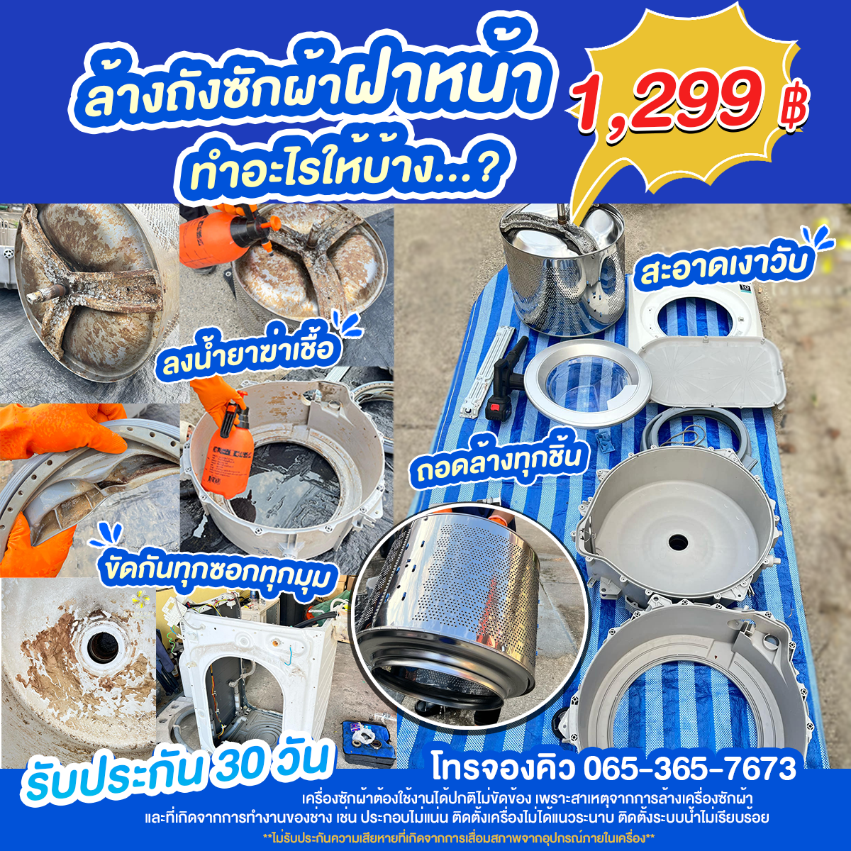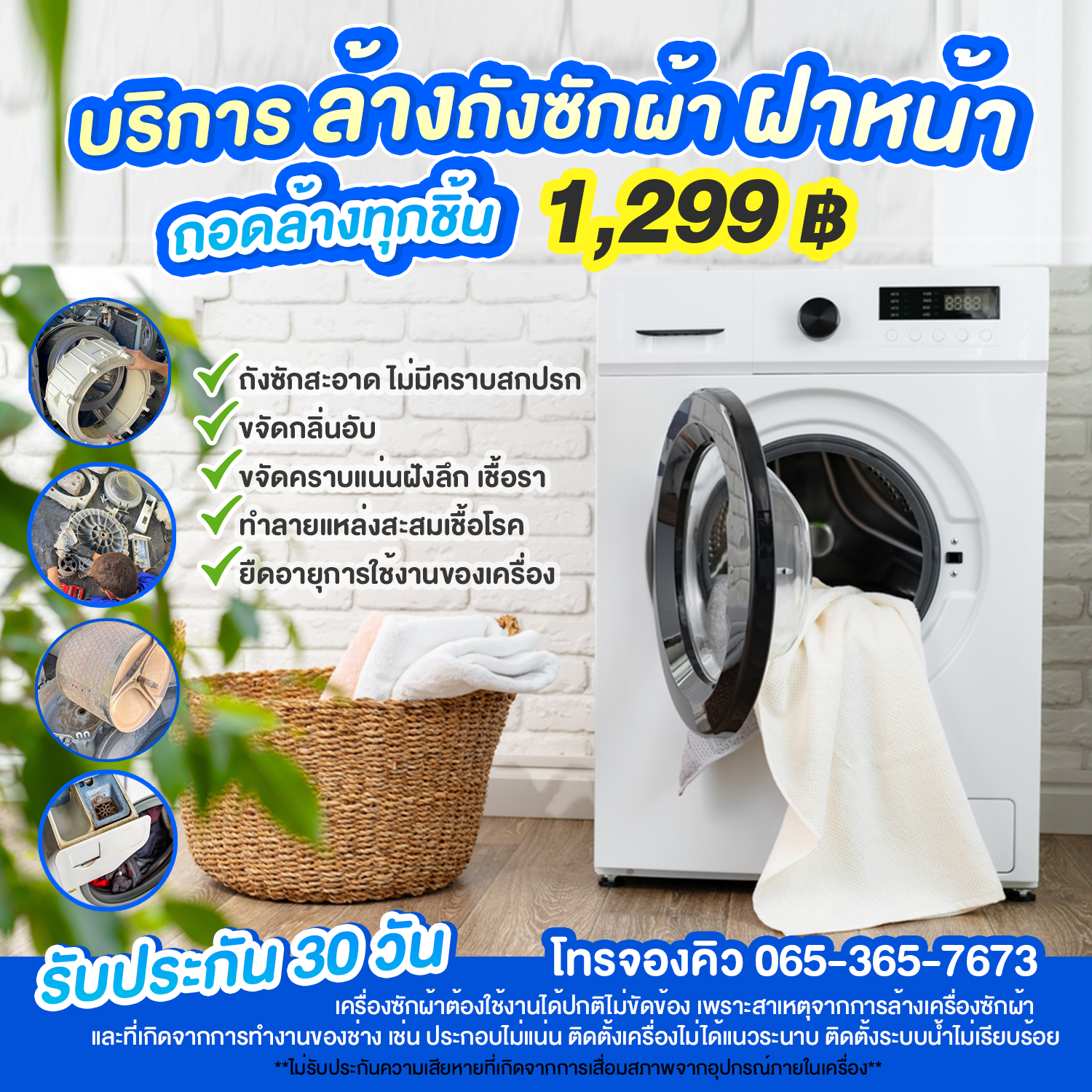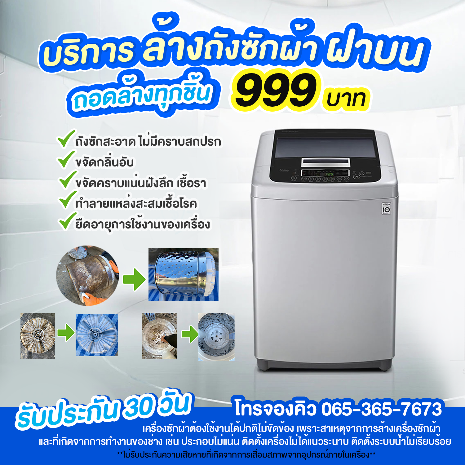 - รับประกันงานนาน 30 วัน เครื่องซักผ้าต้องใช้งานได้ปกติไม่ขัดข้องเพราะสาเหตุจากการล้างเครื่องซักผ้า